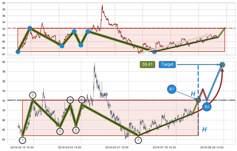 ➢ 上涨矩形整理:猜想临近关键阻力位突破点 → 临近拐点上涨 → 机会信号 → 大趋势均值回复