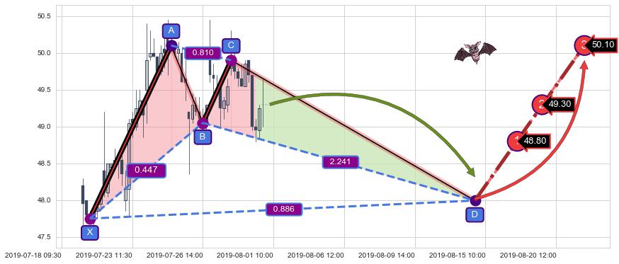 ➣ 谐波蝙蝠:猜想c点拉升接近b点后强阻力来临下沉下跌(均值回复)