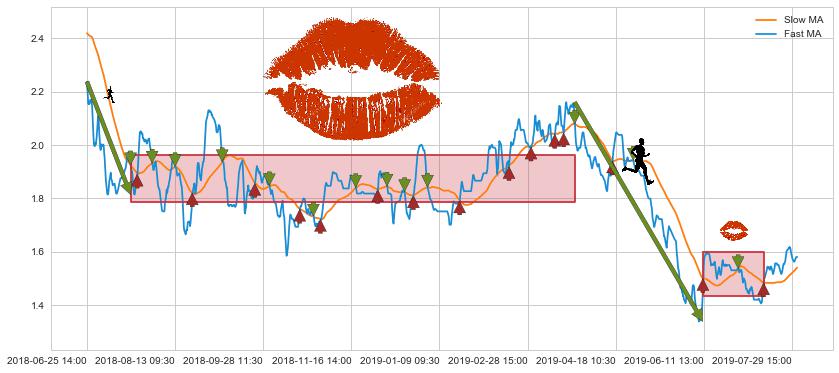 07-19 10:30至03-26 14:00 慢线与快线多次接触,存在上下穿越,有缠绕