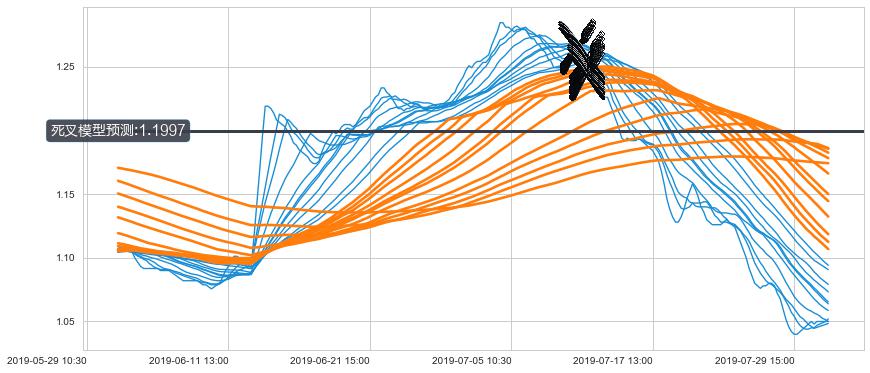 ➢ 55小时均线于(07-11 13:00: 1.2573)形成【死叉】基于【死叉历史模型】预测死叉后最低波谷价格: 1.2074, 死叉后最低价格1.0400,已经下跌超出预测最低波谷价格, 预期反弹