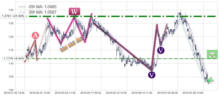 ♘ 阻力价格位1.2761,可信任强度96.76%,距离最后交易2019-07-31 15:00形成的收盘价格1.0500相差 +21.53%