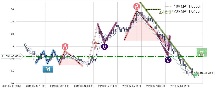 从2019-07-04 09:30至2019-07-31 14:00,共包含119个小时,阶段股价下跌-20.16%,阶段股价变动位移路程比: 1 : 3,下跌趋势角度: 48.6
