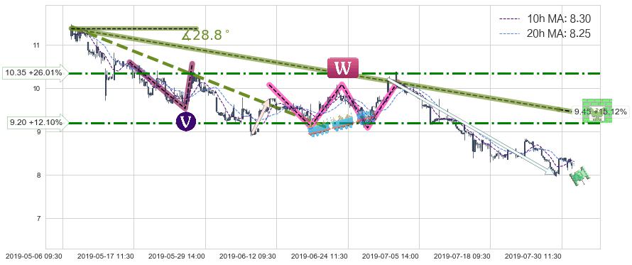 从2019-05-07 09:30至2019-07-30 09:30,共包含343个小时,阶段股价下跌-28.56%,阶段股价变动位移路程比: 1 : 8,下跌趋势角度: 28.8