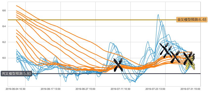 ➣ 70小时均线于(07-08 10:30: 5.90)形成【死叉】基于【死叉历史模型】预测死叉后最低波谷价格: 5.71, 死叉后最低价格5.67,已经下跌超出预测最低波谷价格, 预期反弹