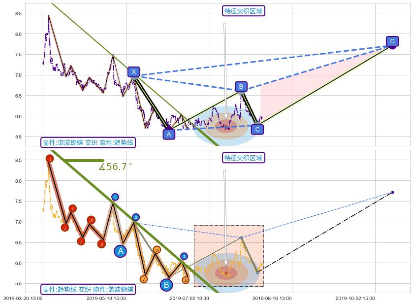 ➢ 谐波蝴蝶:b下跌接近c:猜想支撑性拉升 → 上涨 →【拐点】支撑临近 → 大趋势均值回复