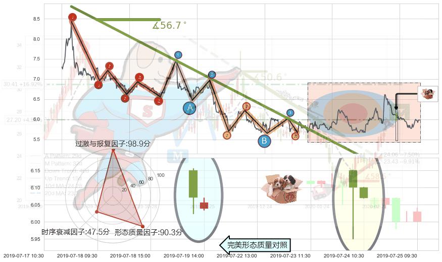 从2019-03-22 15:00至2019-06-24 15:00,共包含361个小时,阶段股价下跌-34.15%,阶段股价变动位移路程比: 1 : 9,下跌趋势角度: 56.7