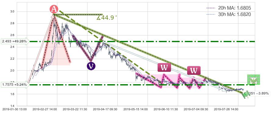 🦴 长线均值回复组合短线趋势跟踪[强阻力信号]2019-02-25 15:00-2019-07-30 09:30下跌趋势依然成立(下跌趋势跟踪依然存在),短线价格略微上行反弹(均值回复猜想),即将接近下跌趋势提供的未破位阻力价格:1.6051。