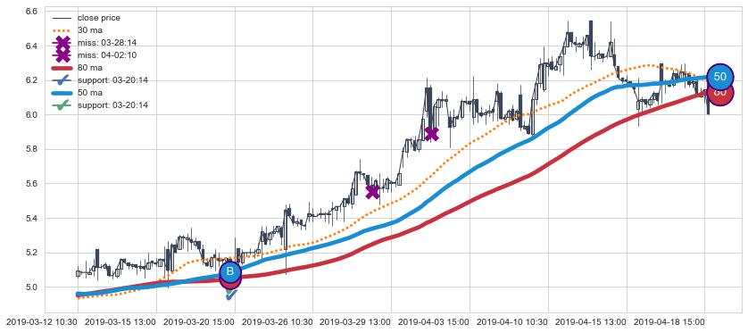 ➢ 最优均线组合共正确确认支撑阻力信号13处,正确确认率 68.42%
