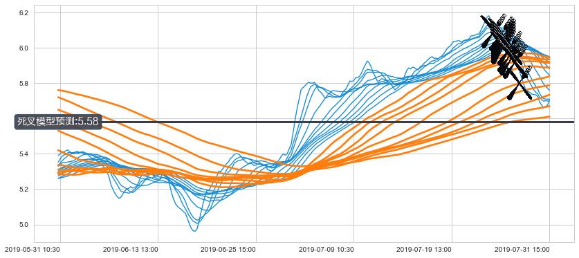 ➣ 21小时均线于(07-25 09:30: 6.09)形成【死叉】基于【死叉历史模型】预测死叉后最低波谷价格: 5.62, 死叉后最低价格5.59,虽然已经到达预测最低波谷价格,但耗时间很短动能很强, 预期继续下跌