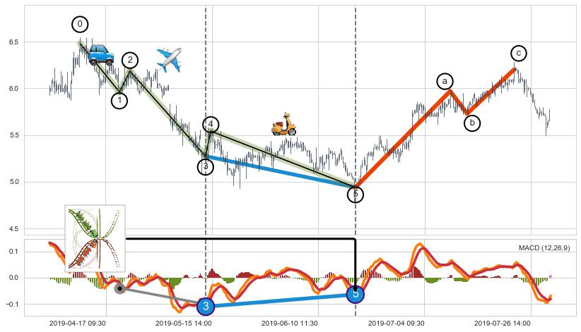 ➣ 波浪理论:猜想达到c点后小反弹终止反转下跌 → 下跌 → 【拐点】临近 → 阶段均值回复结束后继续大周期趋势跟踪