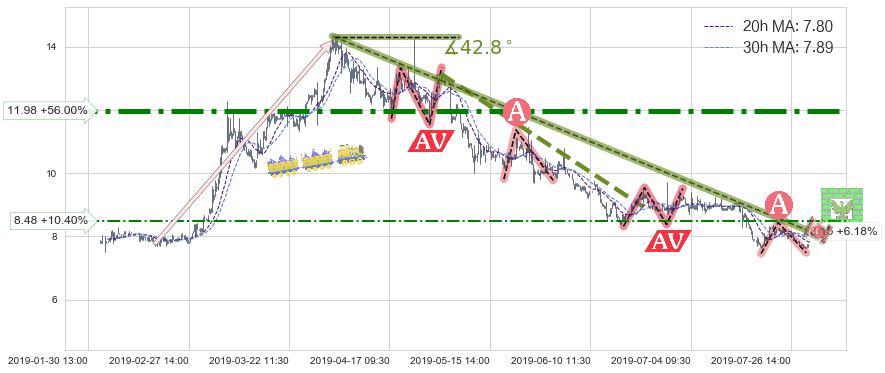 从2019-04-02 13:00至2019-07-31 15:00,共包含477个小时,阶段股价下跌-57.07%,阶段股价变动位移路程比: 1 : 7,下跌趋势角度: 42.8