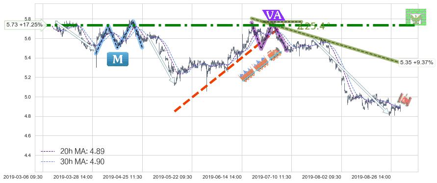 ♘ 阻力价格位5.73,可信任强度96.52%,距离最后交易2019-08-29 15:00形成的收盘价格4.89相差 +17.25%