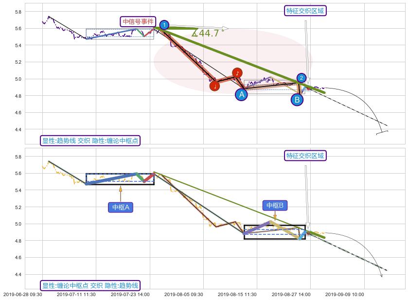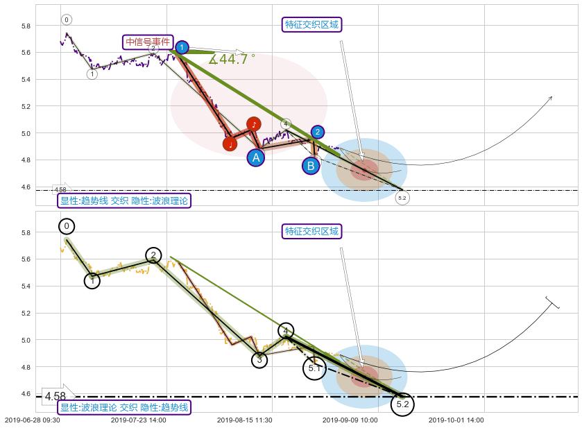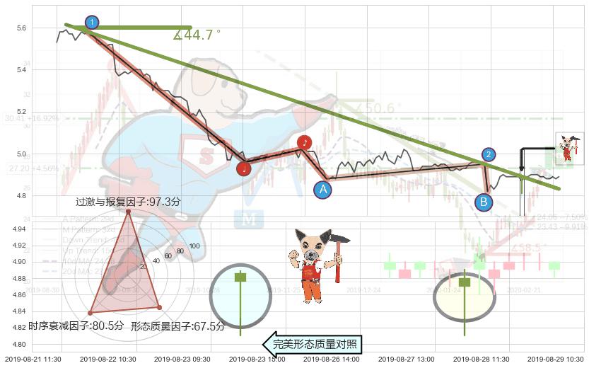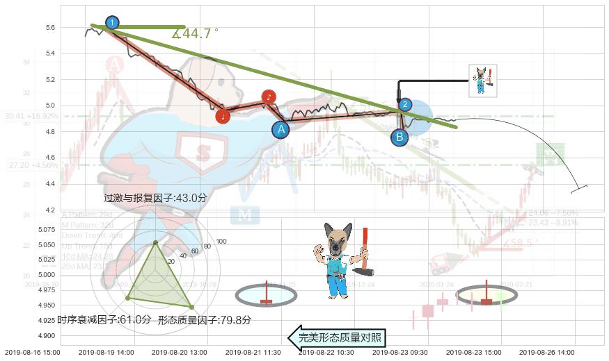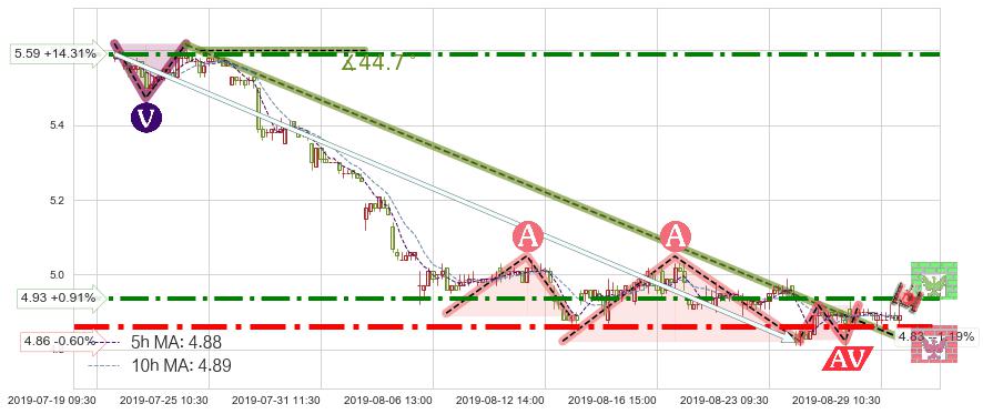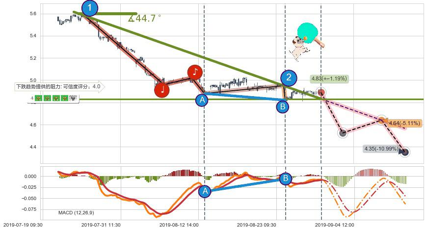🦴 长线均值回复组合短线趋势跟踪[强阻力信号]2019-07-24 11:30-2019-08-27 14:00下跌趋势依然成立(下跌趋势跟踪依然存在),短线价格略微上行反弹(均值回复猜想),即将接近下跌趋势提供的未破位阻力价格:4.83。