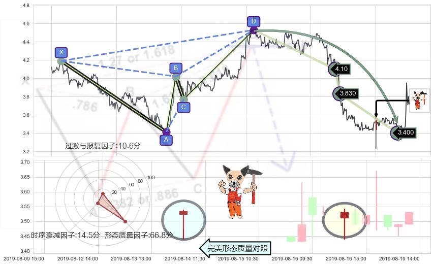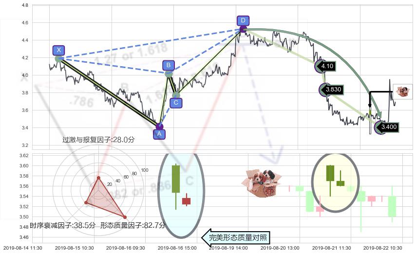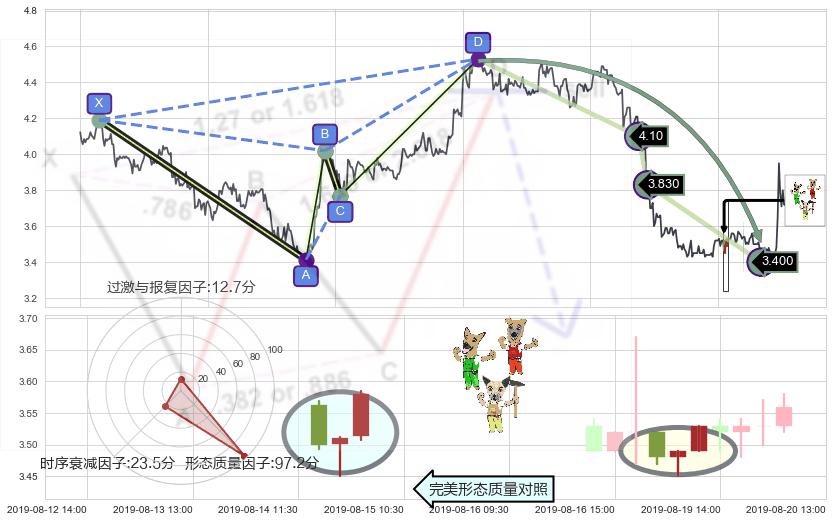 ➢ 🕰 价格走势在2019-08-21 09:30:00至2019-08-21 10:30:00期间形成底部尽头线(上山虎),残存影响值:3.64