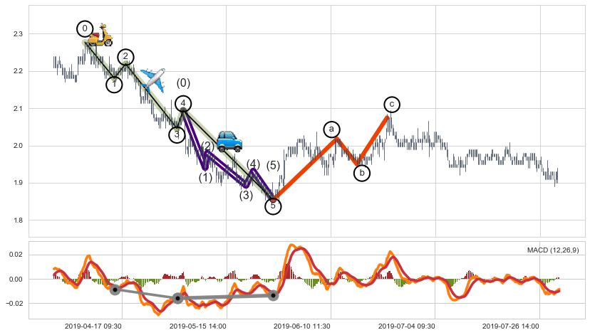从2019-01-30 13:00至2019-02-26 10:30,共包含92个小时,阶段股价上涨14.39%,阶段股价变动位移路程比: 1 : 2