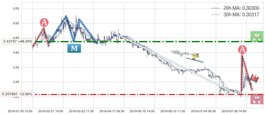 ♘ 阻力价格位0.43757,可信任强度72.53%,距离最后交易2019-07-31 15:00形成的收盘价格0.29500相差 +48.33%
