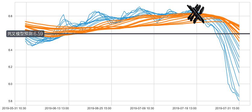 ➢ 80小时均线于(07-19 10:30: 6.83)形成【死叉】基于【死叉历史模型】预测死叉后最低波谷价格: 6.59, 死叉后最低价格5.80,已经下跌超出预测最低波谷价格, 预期反弹