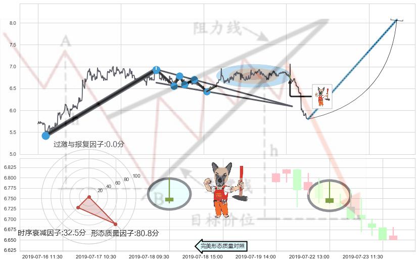 ➢ 🕰 价格走势在2019-07-22 13:00:00至2019-07-22 13:00:00期间形成看涨(低位)倒锤头线,残存影响值:2.18