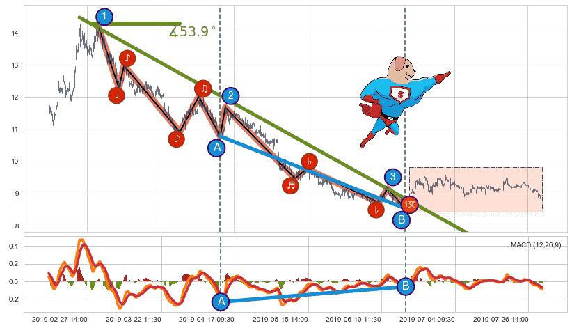 从2019-02-25 15:00至2019-06-21 15:00,共包含469个小时,阶段股价下跌-39.62%,阶段股价变动位移路程比: 1 : 7,下跌趋势角度: 53.9
