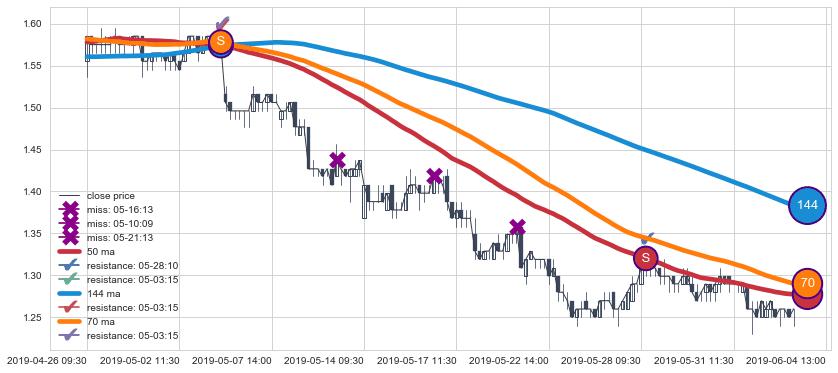 ➢ 21小时均线于(05-03 15:00: 1.5702)形成【死叉】基于【死叉历史模型】预测死叉后最低波谷价格: 1.5269, 死叉后最低价格1.2500,已经下跌超出预测最低波谷价格, 预期反弹