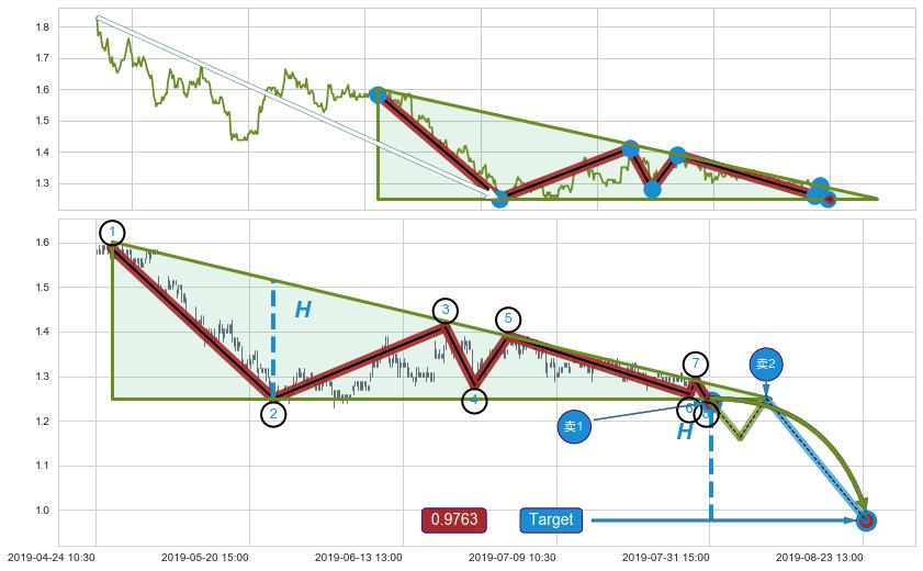 ➣ 最小中继整理跌幅→𝐇: 0.26541 (下侧直角边第一支撑点②与斜边垂直距离)