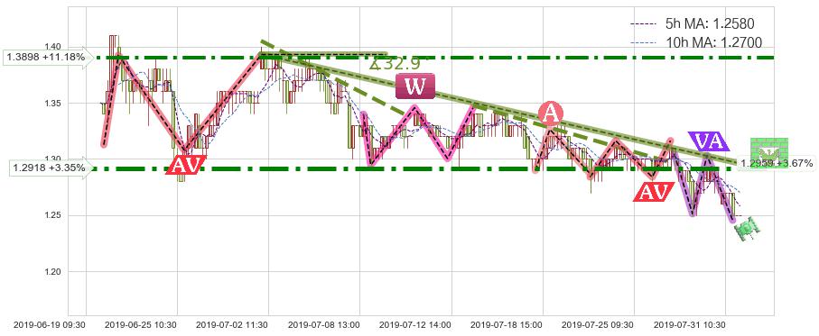 ♘ 阻力价格位1.2918,可信任强度87.78%,距离最后交易2019-07-31 15:00形成的收盘价格1.2500相差 +3.35%