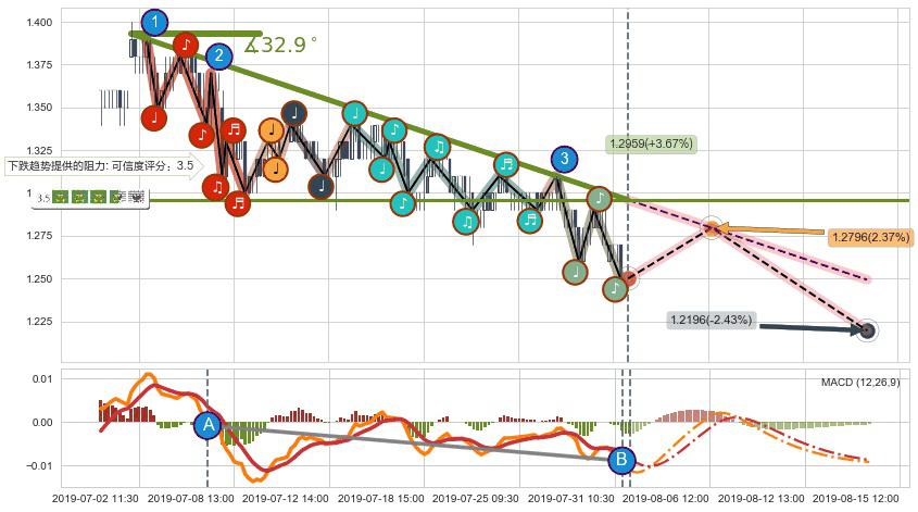 ➢ 预测:2019-08-06 13:00,【小幅反弹】稳定目前下跌趋势的前提下,预测价格:1.2796