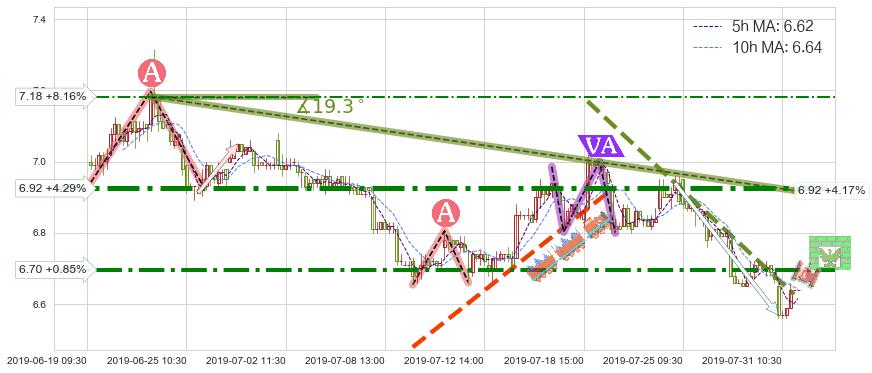 ♘ 阻力价格位6.70,可信任强度77.30%,距离最后交易2019-07-31 15:00形成的收盘价格6.64相差 +0.85%