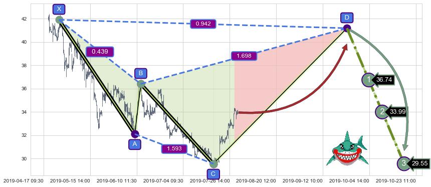 ➢ 单针探底(定海神针) 🔜 谐波鲨鱼下沉击穿c上涨拐点 综合量化分数:54.33 【偏多】