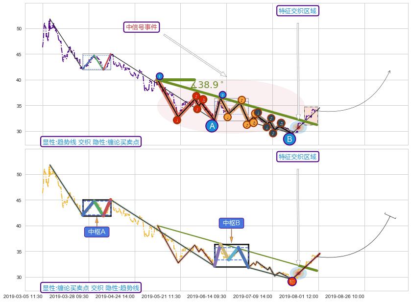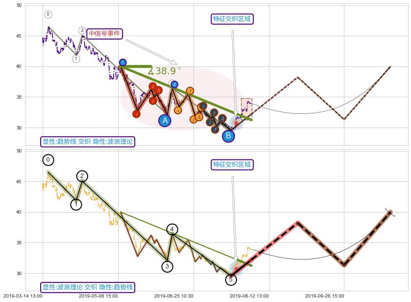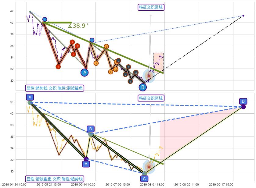 从2019-05-08 09:30至2019-07-23 11:30,共包含309个小时,阶段股价下跌-22.30%,阶段股价变动位移路程比: 1 : 9,下跌趋势角度: 38.9