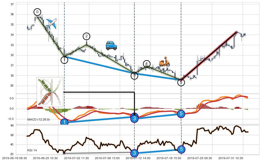 ➣ 第一, 三, 五浪下跌动能逐渐【衰弱变小】,趋势呈现不稳迹象