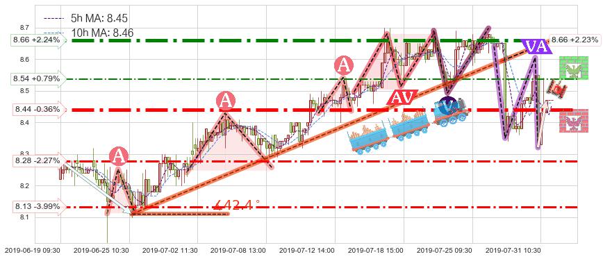 ➣ 2019-06-25 11:30-2019-07-26 15:00上升趋势存在反转[风险],其原上升趋势的支撑位(8.66)已破位[强阻力信号],原上升趋势角度: 42.4˚