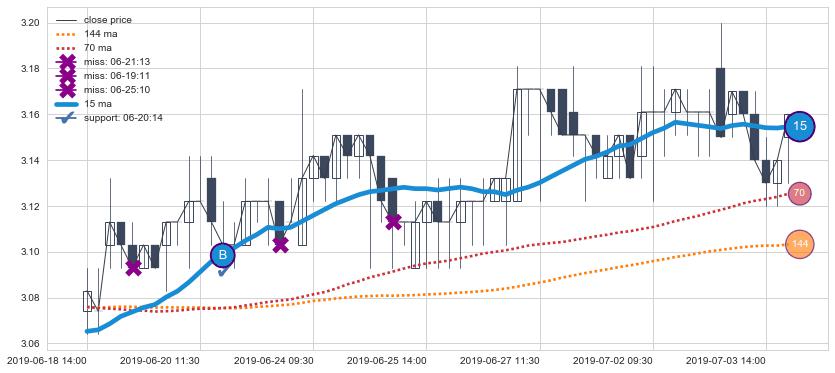 ➢ 70小时均线于(07-19 15:00: 3.133)形成【死叉】基于【死叉历史模型】预测死叉后最低波谷价格: 3.027, 死叉后最低价格3.040,尚未达到预测最低波谷价格, 预期继续下跌