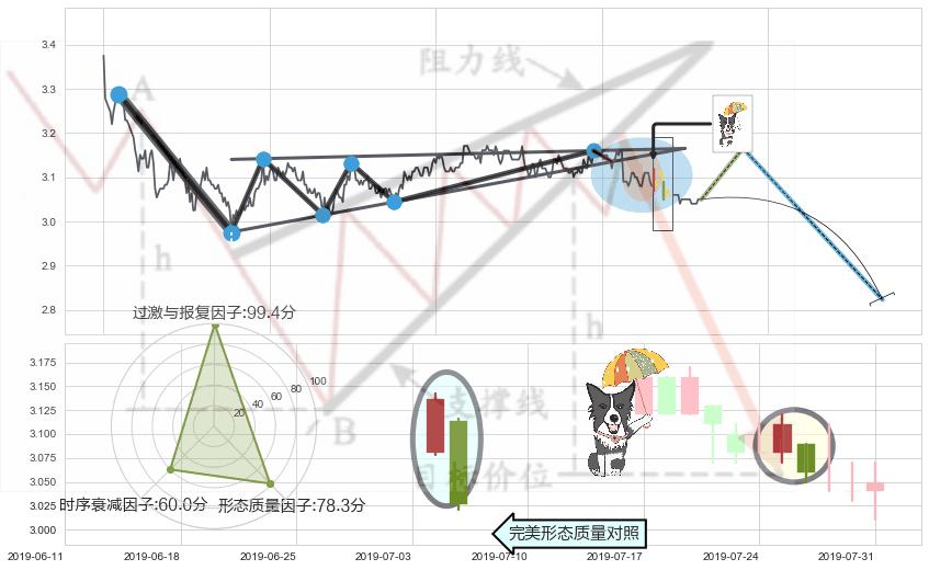 从2019-06-24 11:30至2019-07-31 14:00,共包含159个小时,阶段股价下跌-3.11%,阶段股价变动位移路程比: 1 : 14,下跌趋势角度: 7.9