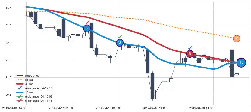 ➢ 最优均线组合共正确确认支撑阻力信号6处,正确确认率 40.00%