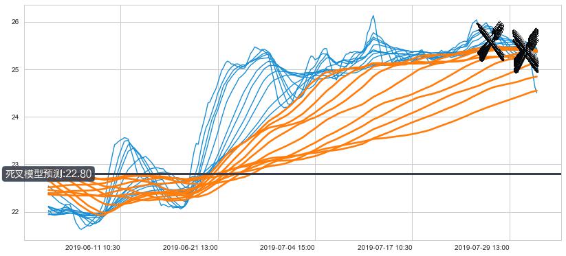 ➣ 21小时均线于(07-30 15:00: 25.41)形成【死叉】基于【死叉历史模型】预测死叉后最低波谷价格: 24.27, 死叉后最低价格24.25,虽然已经到达预测最低波谷价格,但耗时间很短动能很强, 预期继续下跌