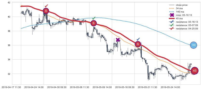 ➣ 144小时均线于(07-22 11:30: 38.29)形成【死叉】基于【死叉历史模型】预测死叉后最低波谷价格: 35.82, 死叉后最低价格35.80,虽然已经到达预测最低波谷价格,但耗时间很短动能很强, 预期继续下跌