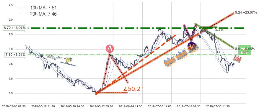 ♘ 阻力价格位7.80,可信任强度41.85%,距离最后交易2019-07-31 15:00形成的收盘价格7.51相差 +3.91%