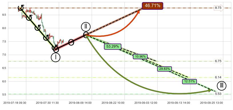 从2019-07-16 13:00至2019-07-31 14:00,共包含68个小时,阶段股价下跌-14.88%,阶段股价变动位移路程比: 1 : 3,下跌趋势角度: 28.4