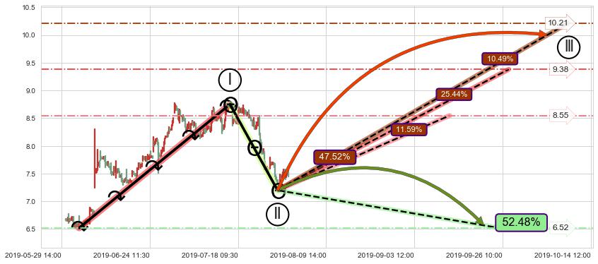 ➣ 调整浪已超过预测的c点位置,但后续大趋势循环浪高概率反转下跌,继续上涨概率47.52%,谨慎做多