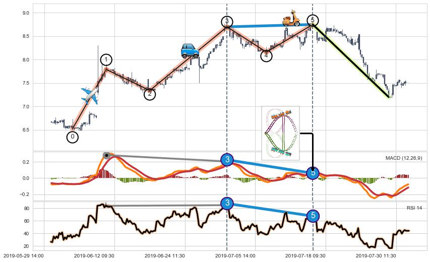 从2019-05-27 14:00至2019-06-18 10:30,共包含88个小时,阶段股价上涨5.87%,阶段股价变动位移路程比: 1 : 9