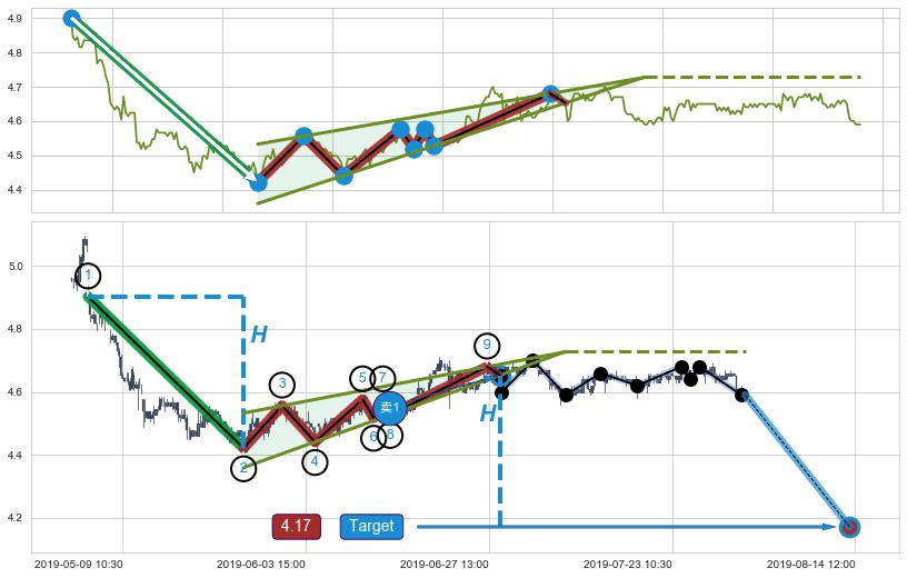 ➣ 最小中继整理涨幅→𝐇: 0.110000 (上平行阻力线与下平行支撑线的垂直距离)
