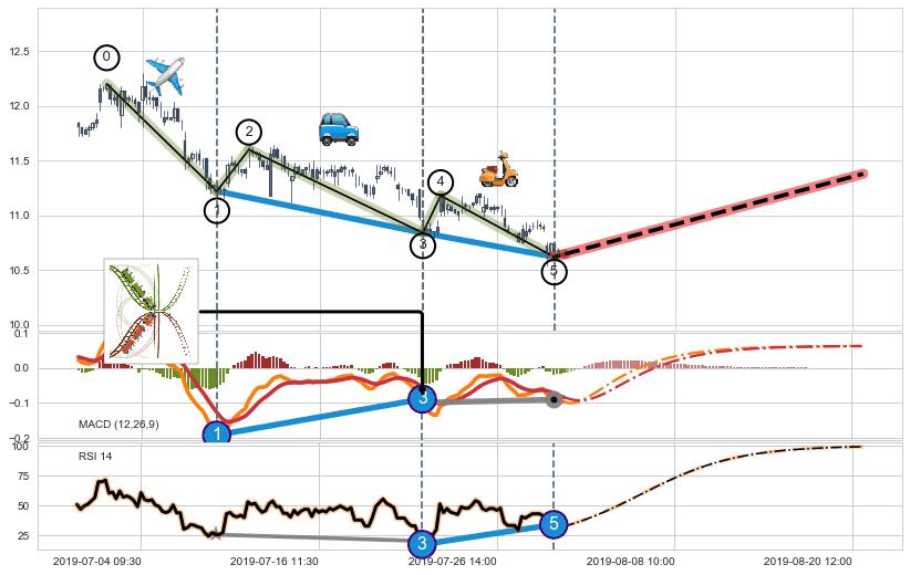 ➣ 第一, 三, 五浪下跌动能逐渐【衰弱变小】,趋势呈现不稳迹象