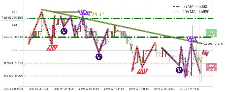 ➢ 预测:2019-08-05 15:00,【小幅反弹】稳定目前下跌趋势的前提下,预测价格:0.5843