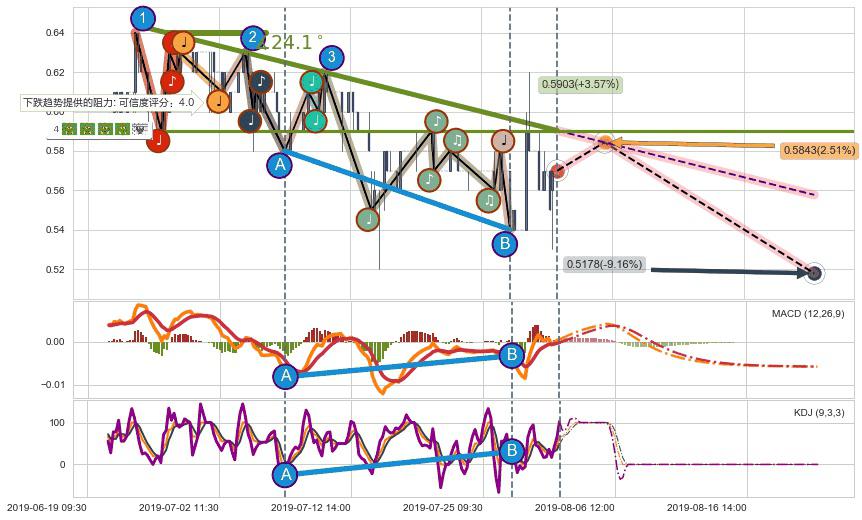 ♘ 在最后的下跌阶段2019-06-24 09:30至2019-07-29 14:00,存在 持续未破位的阻力位 ,阻力价格0.5903,可信任强度82.27%,其距离最后价格0.5700相差 +3.57%