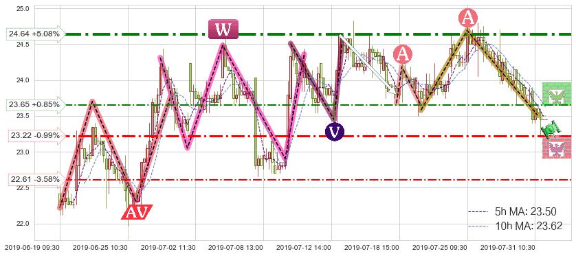 ♘ 支撑价格位23.22,可信任强度56.53%,距离最后交易2019-07-31 15:00形成的收盘价格23.45相差 -0.99%