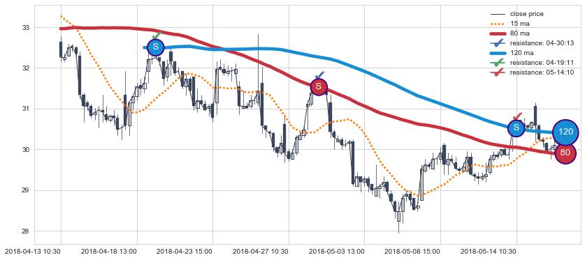 04-13 10:30至05-15 15:00 慢线与快线呈空头排列, 慢线与快线接触少,无缠绕