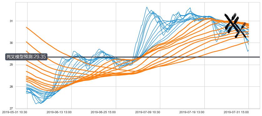 ➣ 60小时均线于(07-26 11:30: 30.94)形成【死叉】基于【死叉历史模型】预测死叉后最低波谷价格: 29.46, 死叉后最低价格29.30,虽然已经到达预测最低波谷价格,但耗时间很短动能很强, 预期继续下跌