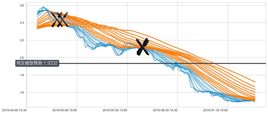 ➣ 45小时均线于(06-06 11:30: 2.126)形成【死叉】基于【死叉历史模型】预测死叉后最低波谷价格: 1.9758, 死叉后最低价格1.4800,已经下跌超出预测最低波谷价格, 预期反弹