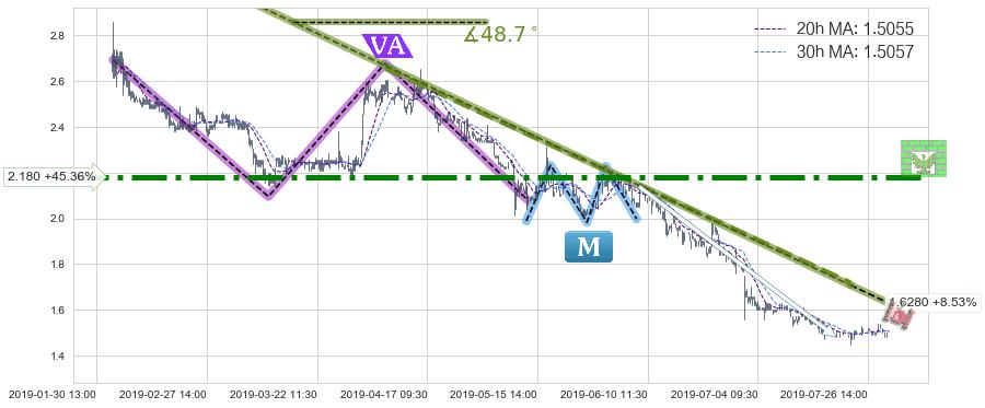 ♘ 在最后的下跌阶段2019-02-01 15:00至2019-07-24 09:30,存在 持续未破位的阻力位 ,阻力价格1.6280,可信任强度86.37%,其距离最后价格1.5000相差 +8.53%